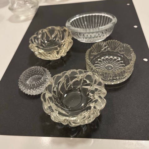 SALTKAR - fine saltkar som kan bruges til både salt, sennep mv og smykker til priser fra kr. 20- kr. 60. Målt i cm