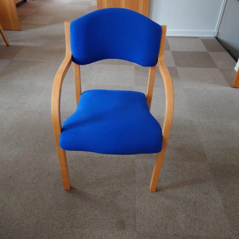 Flot og stabil stol med buet ryg og blåt polstret sæde.