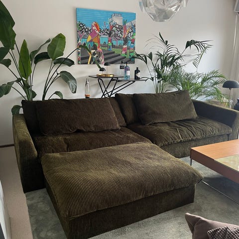 Flaskegrøn - Lækker Flyder - venstrevendt chaiselong - Stof i Diamond 1125 Moss stof, Ben i sortmalet træ