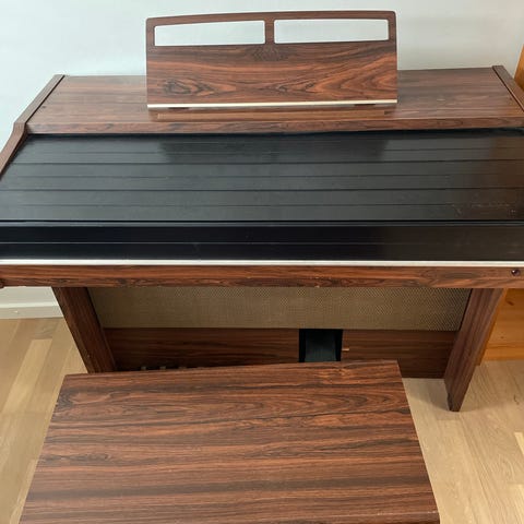 Elektronisk orgel med to klaviaturer (tangenter) og pedaler. Instrumentet har flere farvede knapper til forskellige lydindstillinger. Fremstillet i træ med mørk finish. Velegnet til musikundervisning og hjemmebrug.