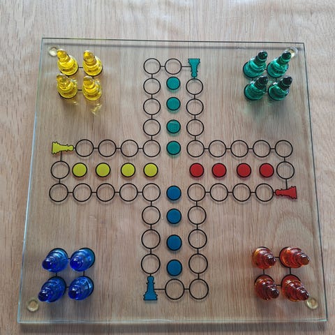 Drinking Ludo brætspil med spilleplade og fire sæt af glas i forskellige farver (rød, blå, grøn, gul). Spillepladen er kvadratisk med farvede felter til hvert hold. Materialer inkluderer plast til spillepladen og glas til spillernes drikkeglas. Spillet er designet til brug for voksne og kombinerer klassisk Ludo med drikkespilselementer.