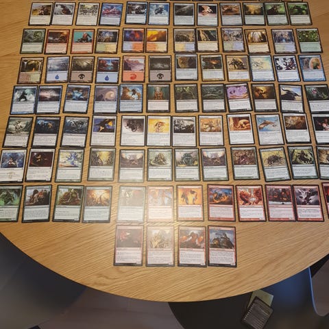 Magic: The Gathering Kortspil Diverse Kort i forskellige farver og motiver. Kortene viser varierende illustrationer og tekst, brugt til strategisk spil. Kortene er spredt ud på et bord i flere rækker og kolonner, og inkluderer forskellige typer og sjældenheder.