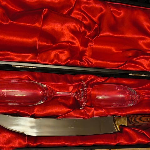 Laguiole champagnesabel, model "Small Sabre Gourbera". Aldrig brugt, men har prøvet en magen til, som fungerede rigtig godt.