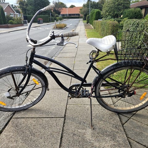 Paul Frank Nirve Beach Cruiser. Gul med lyseblå skærme og sæde. Kun 1 gear. 26” dæk. Lang sadelpind, så den kan bruges af personer mellem 150 og 180 cm.