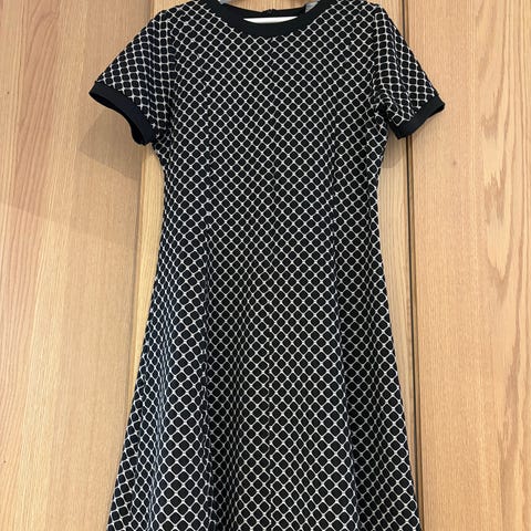 Helt ny sort kjole med hvide prikker i str. 40. Yderkjole i chiffon og sort inderkjole. Med elastisk talje samt bælte omkring. Lukkes ved halsen med to knapper. Polyester. Måler ca. 130 cm i længden, og ca. 100 cm over brystet. Super flot! Sender gerne.