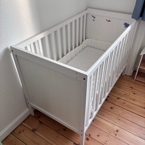 Sælges Hensvik Ikea tremmeseng med comfort madras, sengeramme samt uro med musik lys og bevægelse.