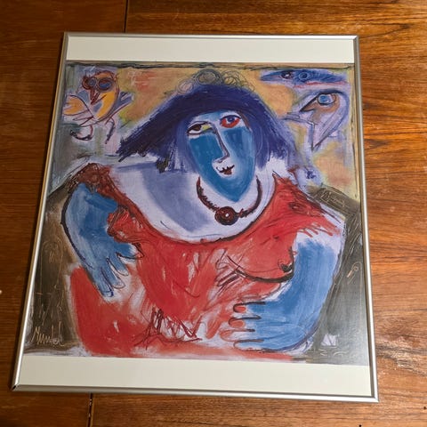 Signeret. Indrammet: hvid træramme. , Bente Merrild, motiv: “Den udfyldte