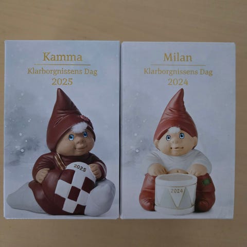 Jeg sælger disse 2 klarborg nisser Sebastian og Mia I høkasser. De er hele og pæne og ingen skår I dem. De er I æsker. Sender gerne men portoen kommer oveni. Sender med Dao. Befinder sig I Helsingør. Fast pris. Prisen er 150 kr pr. Stk.. Er sat til salg I flere grupper