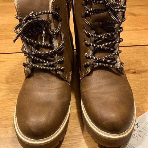 Sælger et par brugte Rieker støvler i en flot brun farve. Støvlerne har snørebånd og en lynlås på siden, samt en dekorativ detalje øverst. Perfekte til efterår og vinter.