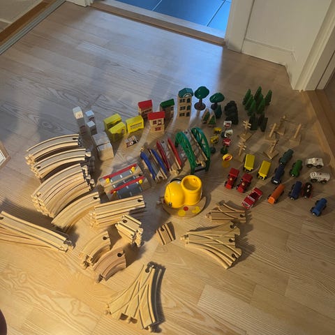 IKEA Trä Tågbanesæt består af træskinner og små træbiler i forskellige farver. Sættet indeholder lige og buede skinner, som kan sammensættes til en togbane. Materialet er træ, og sættet er designet til børn.