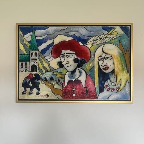 Stort maleri af Henry Barrach 100 x 100 cm. “Opstilling med høns”. Malet i 2007