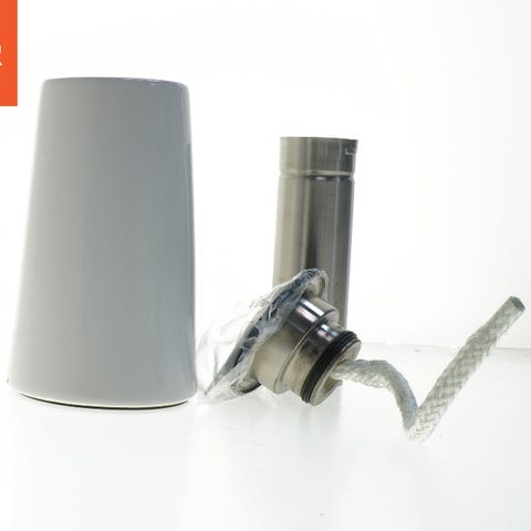 Light House Olie bordlampe i hvid terrazzo materiale. Lampen har en cylindrisk form og er designet til brug med olie som brændstof. Den har en metalholder til vægen og en kæde til justering af lysstyrken. Velegnet til brug udendørs som dekorativ belysning.