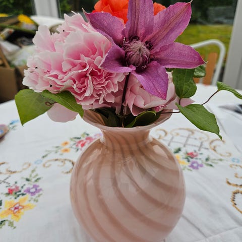 Blæst glas med vertikal optisk ribmønster og klar knopfod i perfekt stand. Højde 28cm, diameter i toppen 22cm. (lot 3002)