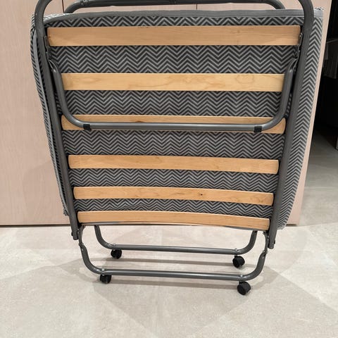 Praktisk gæsteseng el. Solseng. Ramme i blå stål. Skumgummi madras med aftagelig betræk