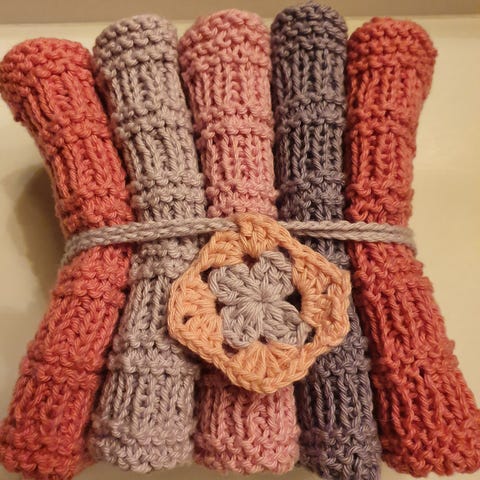 Flotte hjemmestrikkede karklude / vaskeklude i 100% bomuld med strop, så de kan hænge på en krog. Meget flot kant.