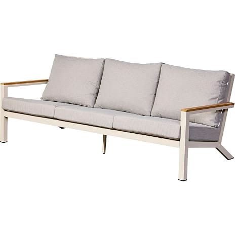 Her får du et loungesæt til 5 personer bestående af en sofa, 2 stole og 1 bord, der skaber den perfekte atmosfære for afslapning og nydelse. Rammen er af sandy grey pulverlakeret aluminium. Armlænene og bordpladen er lavet af teaktræ. Det medfølgende hyndesæt er i en elegant beige farve som fuldender oplevelsen. Loungesættet leverer optimal komfort og er samtidig ekstremt holdbart og af høj kvalitet. Hyndesættet kan modstå ustadigt sommervejr, men det anbefales stadig at tage dem ind, hvis det regner kraftigt. Gør dig klar til sommeren med dette enestående loungesæt.
