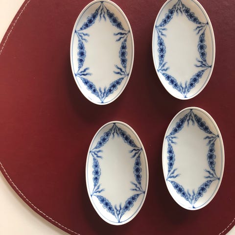 Empire stel fra Bing & Grøndahl porcelæn 1948-1852 mrk. 233. 1. Sortering. Servietholder med blå blomsterdekoration. Fremstillet i hvidt porcelæn med blå håndmalede detaljer.