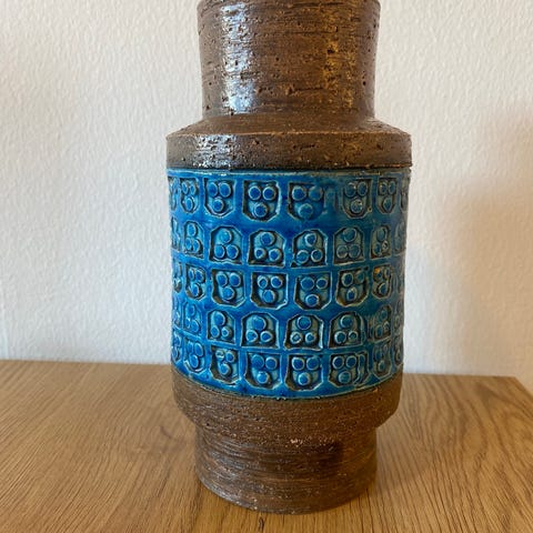 Italiensk antik vase i keramik med rød og grå farvetone. Vasen har en dekorativ mønster med dyremotiver og en cylindrisk form.