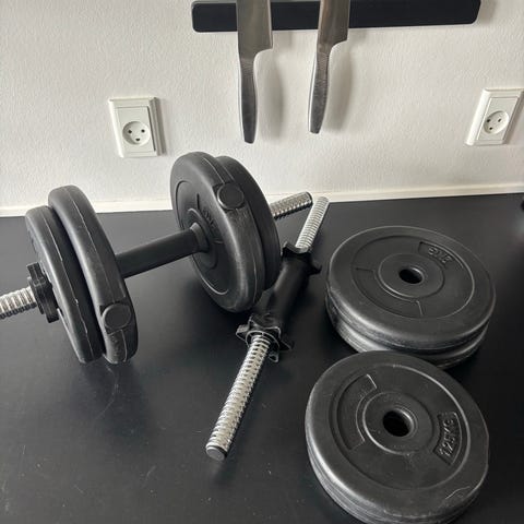 Har dette håndvægtsæt med 17 kg i det hele, jeg har stort set ikke brugt det så det fejler intet.