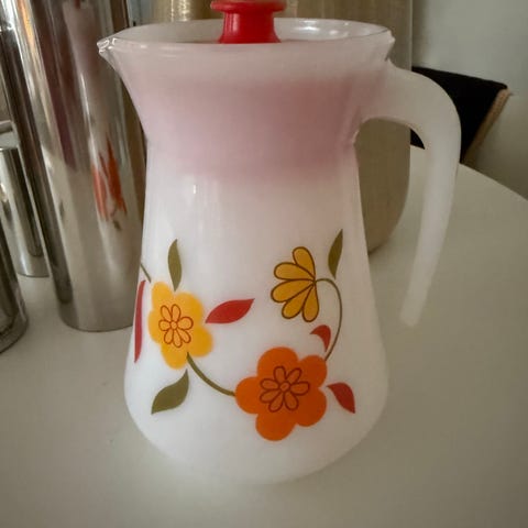 Vintage fransk lyserød emalje kande med blomsterdokoration. Lettere rusten. H 20 cm. Hyggelig til sommerhuset eller kolonihavehuset eller som vase
