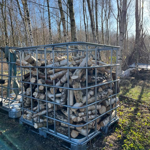 Birke brænde savet i 25 cm. Og kløvet, klar til brændeovn. 800 kr. pr. Bur . Bur følger ikke med.