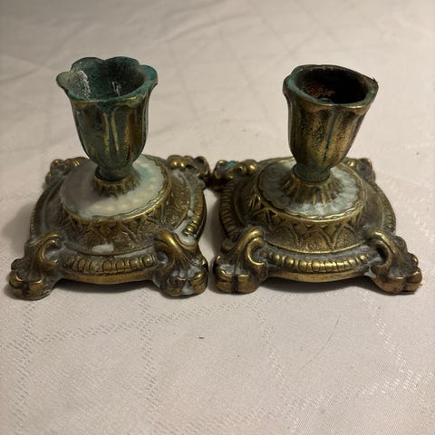 Et par ældgamle lysestager i messing. Arvestykker. Skal pudses op.