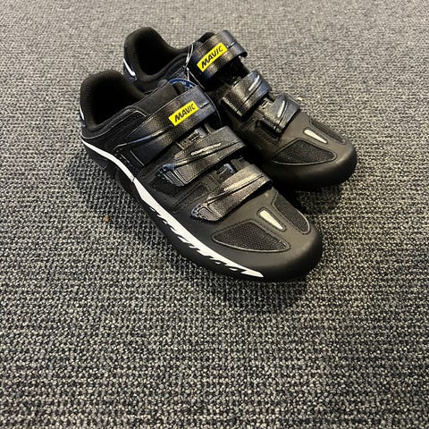 Mavic Road Cycling Shoes in size 45, black color. These shoes feature a synthetic upper material with mesh panels for ventilation, three adjustable straps for secure fit, and a stiff sole compatible with cleats for road biking. Designed for road cycling use, suitable for male or female cyclists.