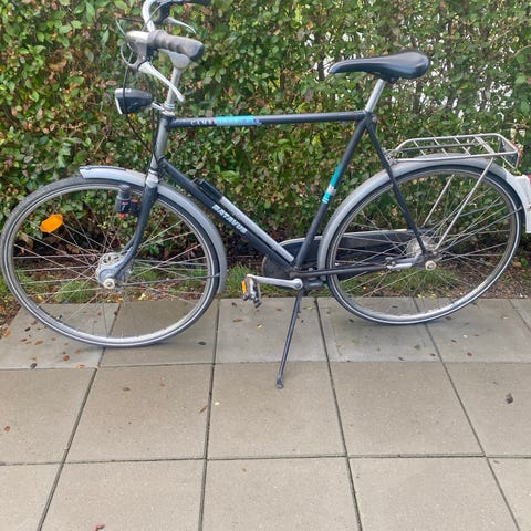 Batavus Herrecykel med 22" hjul. Cyklen har en klassisk ramme i mørk farve, kædeskærm og bagagebærer. Designet til mænd og håndbygget i Holland. Baghjulet er skævt derfor den billige pris