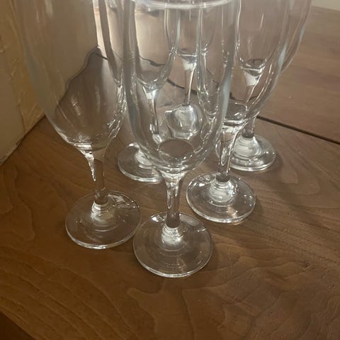 10 stk champagne glas, enkelte af dem har et rødt mærke i bunden