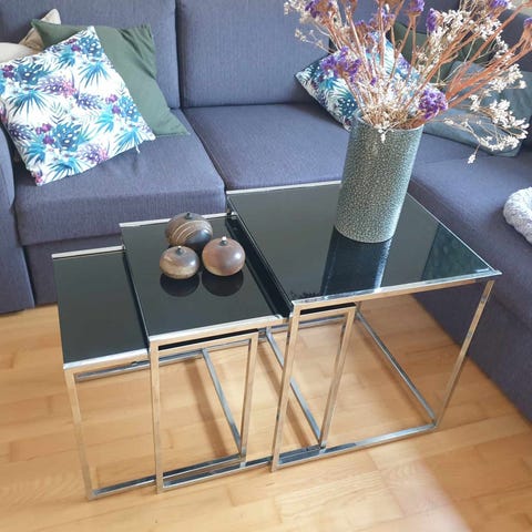 Indskudsborde i krom og sort glasplade i et råt og maskulint look. Perfekt i en maskulin indretning, men kan også blødes op med pastelfarver og levende lys.