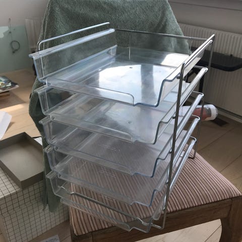 Fint stativ med 3 plastikbakker. Ca. 23 x 40 cm totalt. Hver rød plastikbakke måler ca. 34x24 cm. Stativet er hvidt og lavet så bakkerne er forskudt af hinanden og nemme at få fat i. Fint og intakt.