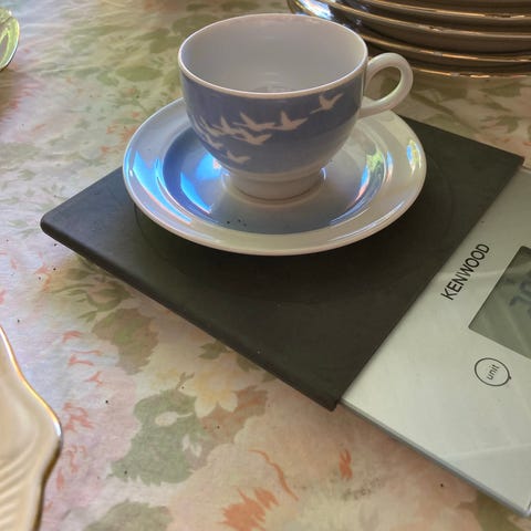 12 par kopper med tilhørende underkop og kagetallerken, samt en ekstra kop,