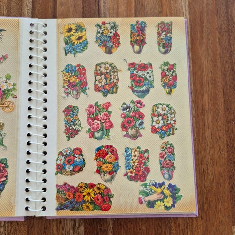 Glansbilledebog med meget gamle glansbilleder. Motiver: børn, katte og hunde.