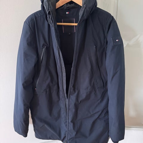Velholdt Tommy Hilfiger vinterjakke i sort farve, størrelse 152. Jakken har aftagelig hætte, lynlås der også kan åbnes nedefra og knapper foran samt lommer med klap. Egnet til koldt vejr.