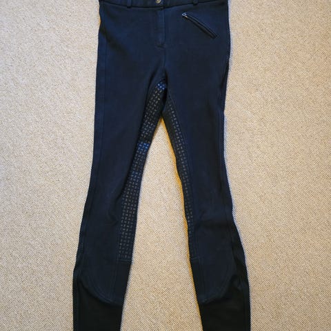 CRW Ridebukser i sort farve, størrelse 38. Bukserne har grip på indersiden ved knæ og numse. Materialet er elastisk og tilpasset til komfort og bevægelsesfrihed under ridning.