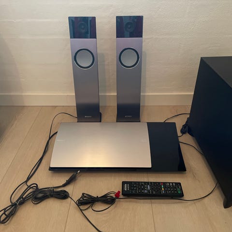 Sony STR-DE875 Hi-Fi System Hjemmebiograf med flere fem højttalere + to originale højttalerstander samt subwoofer, i sølvfarve.