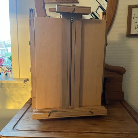 Sæt bestående af to træstaffelier. Egnet til at holde malerier eller billeder under arbejde eller udstilling. Fremstillet i træ med justerbar støtte. Velegnet til hobbybrug eller mindre kunstprojekter.