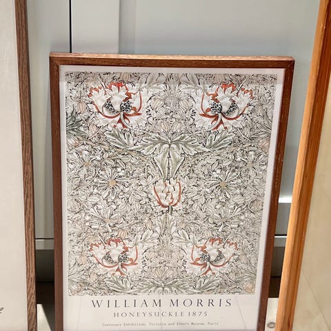 William Morris Centenary Exhibition plakat med dekorativt mønster af blade og frugter i flere farver på hvid baggrund. Plakaten er indrammet med en gul passepartout og i egetræs glas ramme
