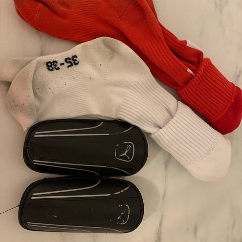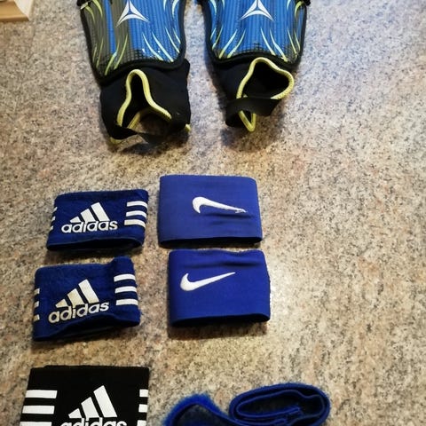 Nike benbeskyttere med holdere og to par fodboldstrømper.