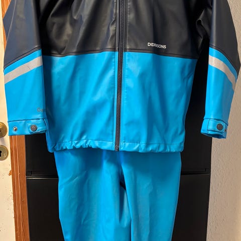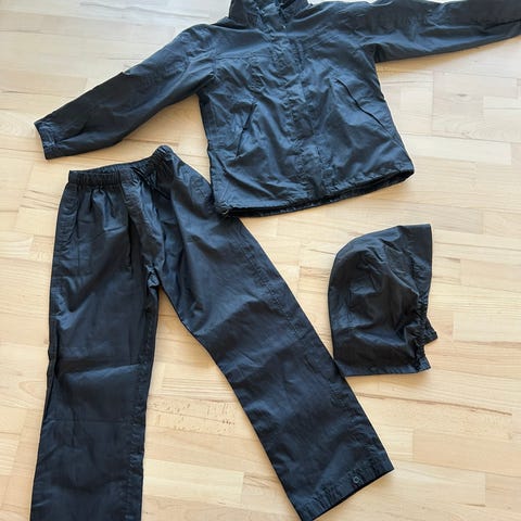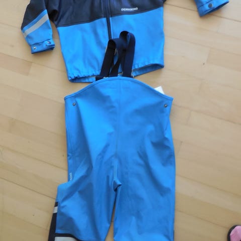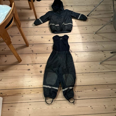 Slaskeman kids set 3, Galon, str 120, fint to farvet regnsæt, m marine blå jakke og army grønne bukser, som er lidt misfarvede nederst v ben og elastikker v ankler slidte, kun vasket en gang