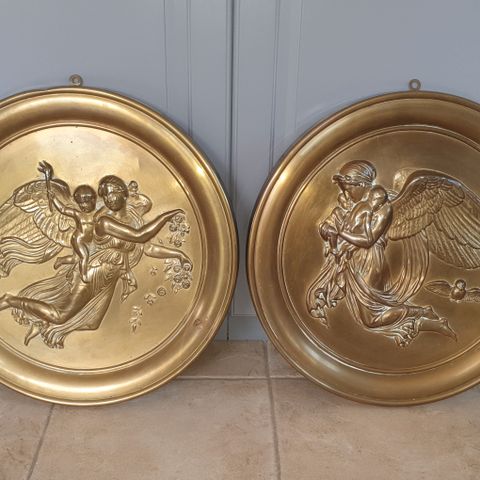 To dekorative platter i gips. Runde med diameter på ca. 31cm med ophæng til vægmontering.