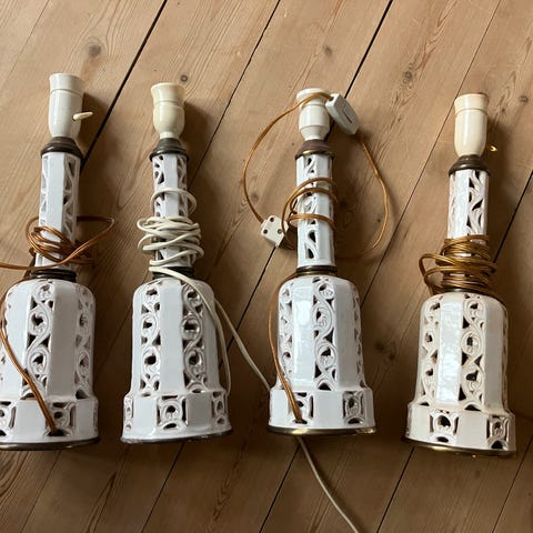 Et par smukke Heiberg lamper fra Laoni Belysning, 1920’er stil. Hvidglaseret porcelæn med messingkant. Begge i super stand, med ny hvid lampeledning og afbryder.