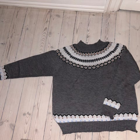 Ved ikke hvad trøjen er lavet af (ingen vaskeanmærkning) vil tro det er polyester. Ærmer er strik. Str. XL