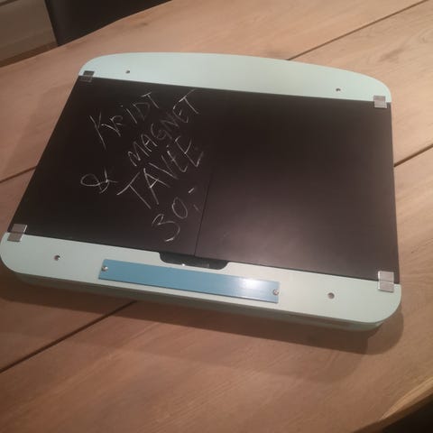 Fin gammel kridttavle. Farven er almueblå. Måler ca. 22x30 cm. Almindelige aldersrelaterede brugsspor, men generelt i fin stand. Dekorativ som den er, men også fin som menuskilt eller lignende.