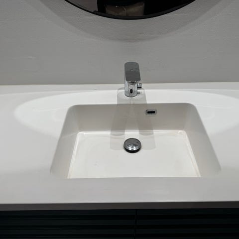 Corian-lignende materiale. Bundventil er slidt og skal skiftes. Derfor den lave pris. Vasken trænger til at blive slebet og shinet op men fejler ellers intet. Vi sælger den, da vi har købt nyt vaskeskab med vask. Vaskeskabet på billederne er i stykker og følger ikke med. Vasken står oven på skabet og lægges ikke ned i skabet som normalt.