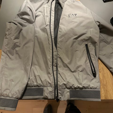 Tynd Armani EA7 jakke i beige farve, størrelse one size. Jakken er designet til mænd og egnet som yderbeklædning. Materialet og størrelse fremgår ikke men jeg vil skyde på det er en L.