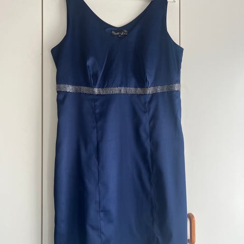 Mascara fest/cocktail kjole i blå farve, størrelse 46. Kjolen har dekorative detaljer ved halsudskæringen. Materialet er let og egnet til formelle lejligheder.