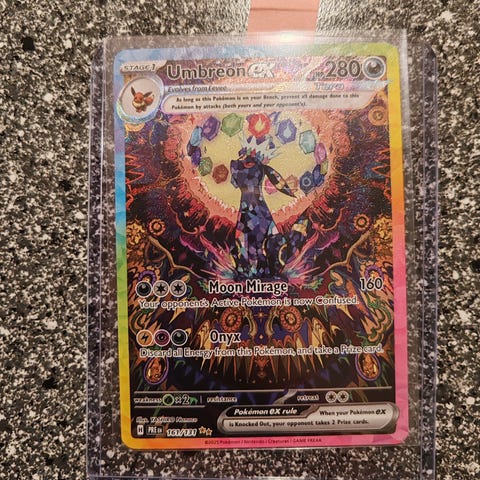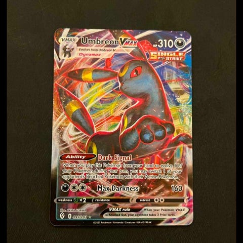 Dette er den sjældne Umbreon v alt art fra det dyre sæt evolving skies, den har ingen skader men sleeven er lidt skadet/ slidt hvis du nu var i tvivl. Jeg er også interesseret i at bytte.