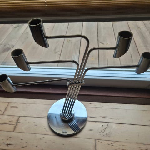 Belt 4 Lysestage fra by Wirth med lysebrun læderrem, designet til at holde fire lys eller en blanding af lys og en kolbe formet glasvase.