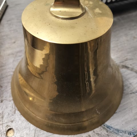 Malmklokke i "rå" malm. H. 29 cm,D: 38 cm. Vægt 16 kg.